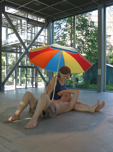 Non nous ne sommes pas à Avignon, c'est vrai. J'ai bougé le week-end dernier. Saurez-vous deviner dans quelle ville je suis allée ? Le lien entre ces deux images, c'est l'Australie : la photo du haut représente Toni et Julius, de chers amis de Sydney en visite ici, et la photo du bas représente une oeuvre de l'artiste Ron Mueck, né à Melbourne. Aujourd'hui il vit à Londres mais ses personnages en maillot pourraient sortir tout droit d'une plage australienne. J'ai beaucoup aimé cette expo ainsi que le film de 40 minutes tourné dans l'atelier de Ron Mueck et qui nous permet de suivre au fil des mois la patiente réalisation de ses dernières oeuvres. Le réalisme hallucinant des personnages qu'il réalise laisse un curieux sentiment de malaise associé à l'empathie. La sculpture qui m'a le plus touchée est "woman with shopping", une jeune mère portant son bébé sur son sein dans un porte-bébé mais incapable du moindre geste d'affection envers son enfant du fait des deux sacs de courses qui lui mobilisent les bras et la tirent lourdement vers le bas. Elle regarde fixement devant elle, elle a l'air épuisé. Le bébé, lui, a les yeux rivés sur le visage de sa mère. Une expo à voir avant le 27 octobre 2013 à la Fondation Cartier pour l'art contemporain .